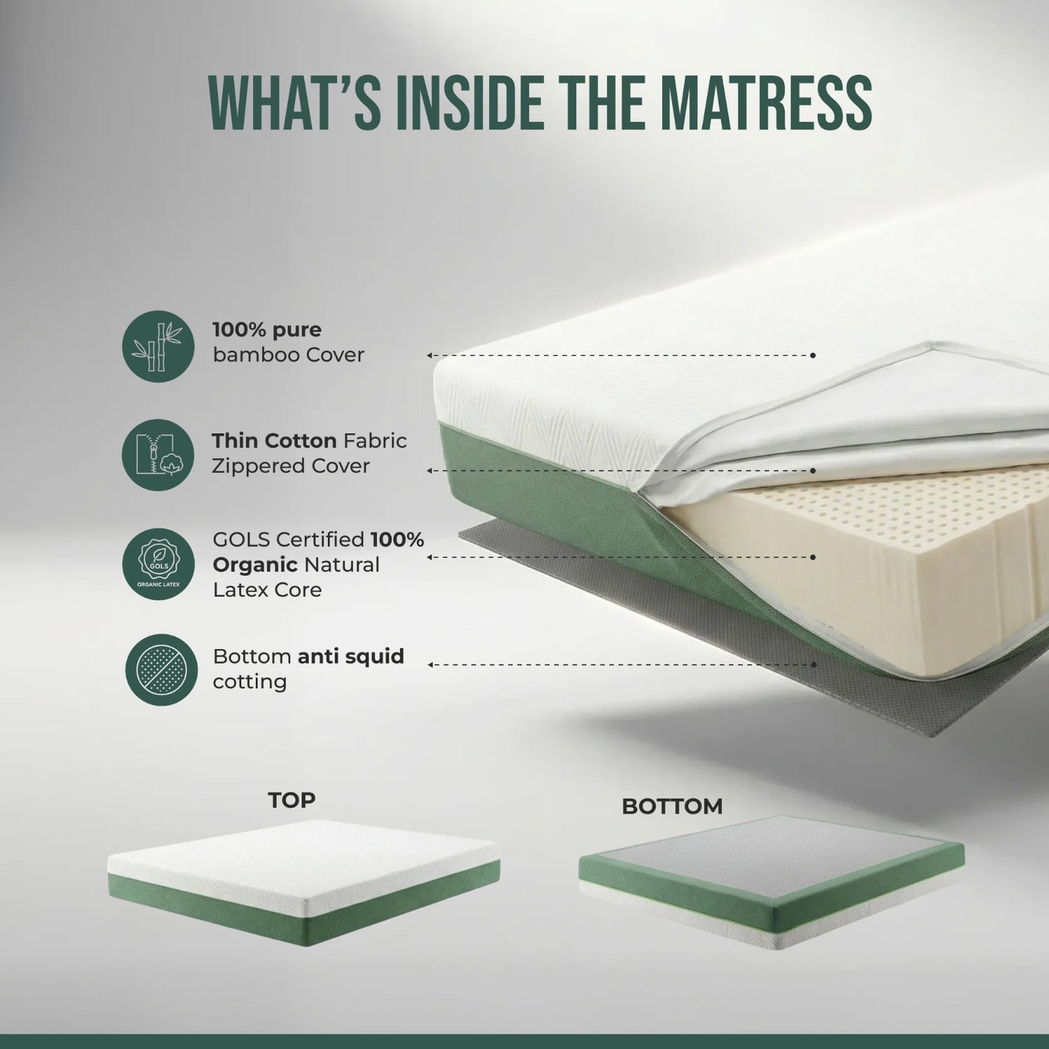 Made with a 100% Natural Bamboo Fabric Cover and Premium Cotton Zippered Inner Cover for breathable, soft, and washable comfort, the GOLS Certified 100% Organic Natural Latex core provides responsive support while the anti-skid base keeps the mattress securely in place.